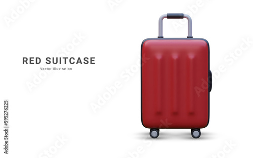Realistic plastic suitcase. Red travel bag isolated on white background. Traveling banner template. 3 D Vector Illustration