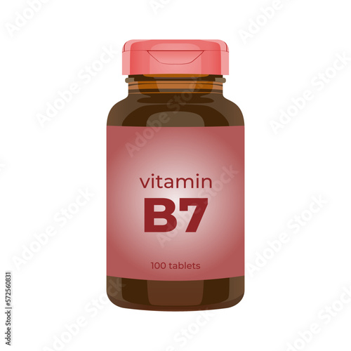 Realistic popular vitamin B7 bottle packaging mockup vector illustration in trendy flat 3d design style. Tablets medicine brown bottle icon. Editable graphic resources for many purposes.