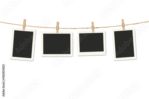 Realistic Retro Blank Photo Frames Hanging on Rope with Wooden Clothespins, Set of 4, Horizontal and Vertical Polaroid Template, Empty Photo Card Mockup for Memory Display and Scrapbooking