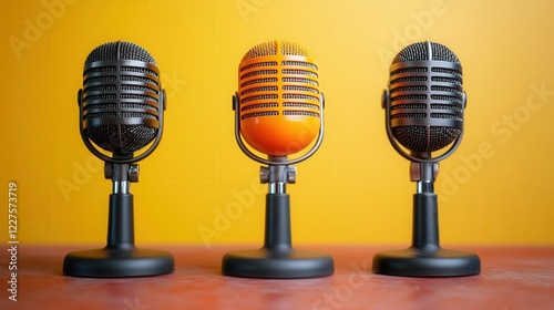 Realistic Set of Three Vintage Microphones on a Bright Yellow Background for Creative Projects