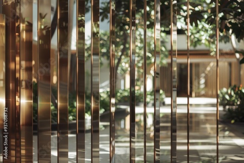 Realistic shot of a close-up view inside the lobby at La Mer, showcasing vertical slats made from bronze