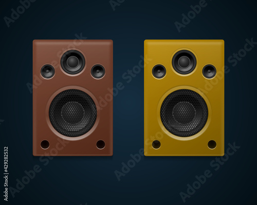 Realistic sound speakers isolated on dark background. Vector illustration.