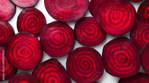 Realistic spread of sliced beetroots on a white background, emphasizing their deep red color and concentric circles