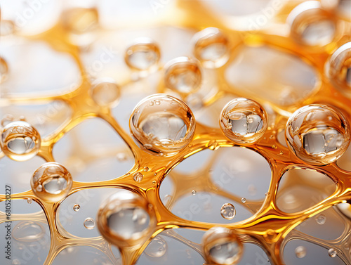 Realistic still lifes with dramatic lighting, abstract background, golden and light silver water on white in the style of molecular structures.