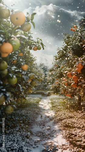 Realistic Summer and Winter Orchard Landscape with Text Space - Growth and Dormancy Symbolism