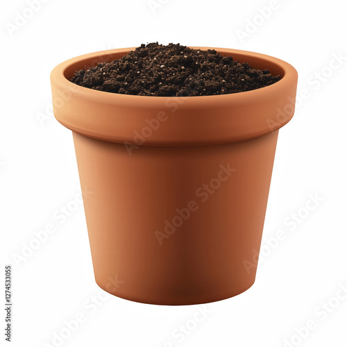 Realistic terracotta flower pot filled with rich dark soil isolated on transparent background.