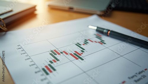 Realistic trading tool depiction featuring printed candlestick chart on report page with pen nearby on wooden desk background