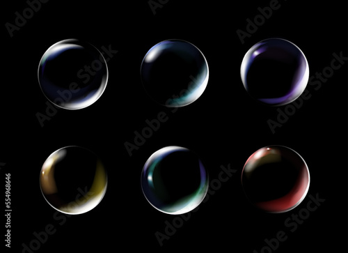 Realistic transparent soap bubbles with rainbow reflection. Isolated set composition