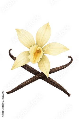 Realistic Watercolor Vanilla Orchid Flower with Crossed Pods Isolated on White