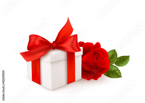Realistic white gift box with red bow ribbon and red rose isolated on white background. Design element for Happy Valentines Day. Vector illustration