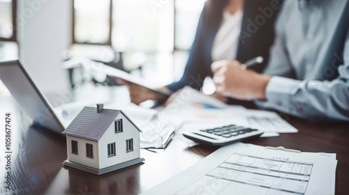 Realtor desk with house model, calculator and documents