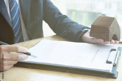 realtor explain mortgage loan agreement to his client. real estate agent or house developer present contract document to customer. sale and purchase property with house model.
