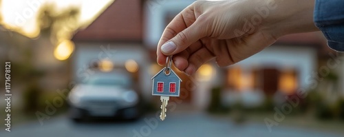 realtor landlord agency holding home property keychain in her hand and giving to tenant in front of house Generative AI