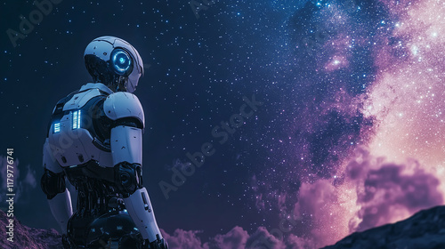 Rear or back view of a robot machine ai artificial intelligence cyborg humanoid standing on a hill, looking at starry sky at night. futuristic technology fantasy landscape, sci-fi galaxy, copy space.