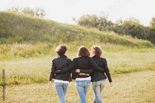 Rear view - three sisters or girlfriends in the same clothes - jeans and leather jackets walking along the lawn of the summer park sunny bright day