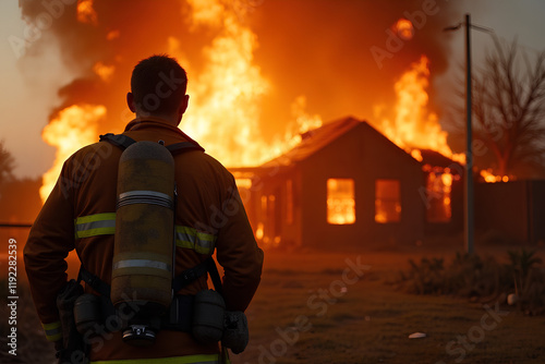 rear view, a tired, sweaty and dirty fireman in his 40s stands and looks at the burning house, a huge fire with a lot of smoke