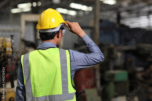 Rear view confident technician engineer and worker in protective uniform standing and holding hardhat while controlling operation checking industry machine process at industry manufacturing