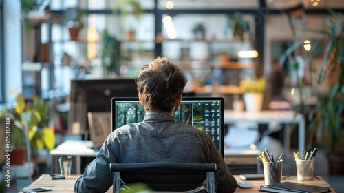Rear view, Employee male working on computer at modern office. Generative AI.