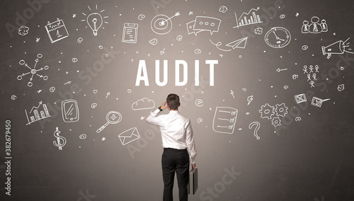 Rear view of a businessman with AUDIT inscription, modern business concept