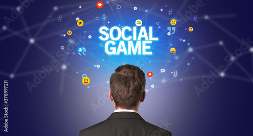 Rear view of a businessman with SOCIAL GAME inscription, social networking concept