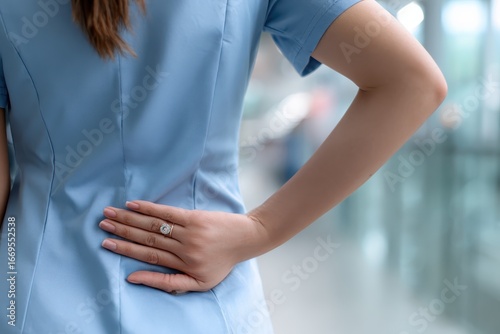 Rear view of a female nurse in a blue uniform standing in a hospital corridor with her hand on her back, conveying signs of fatigue or discomfort during a busy shift