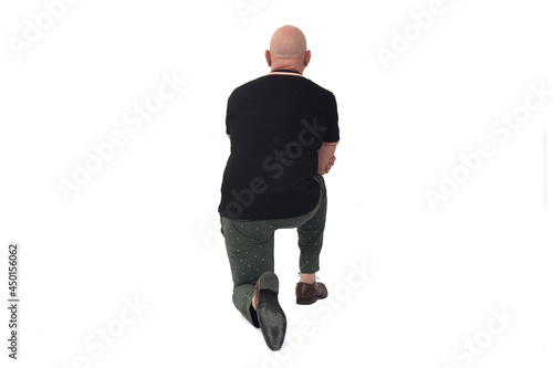rear view of a man leaning on one knee on the ground on white background