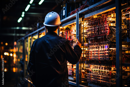 Rear view of a man standing in uniform and hard hat. Engineer standing near the electric panels with numerous wires.