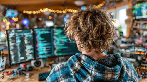 Rear view of a person with curly hair focused on a computer screen displaying lines of code in a cluttered workspace