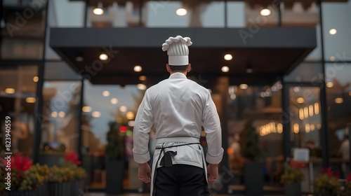 Rear View of a Renowned Chef Entering a Prestigious Gourmet Restaurant Poised for Culinary Brilliance