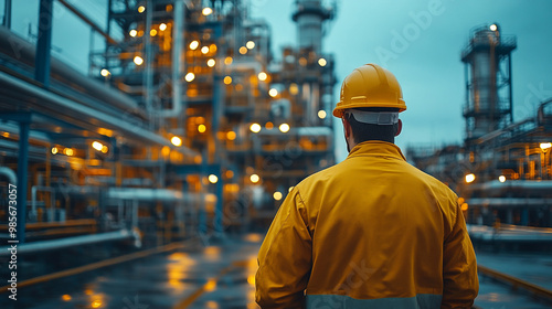 Rear view of engineer worker in uniform and hard hat against background of pipeline and pipe rack of oil industrial plant.