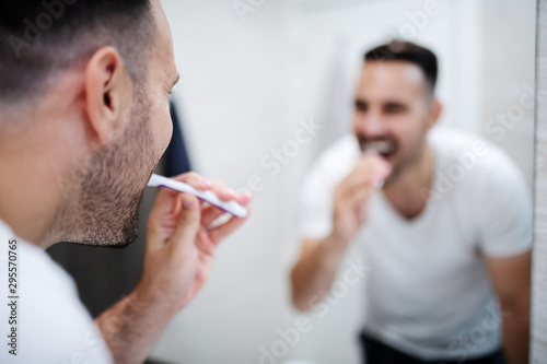 Rear view of good looking man brushing his teeth in morning. Daily routine.