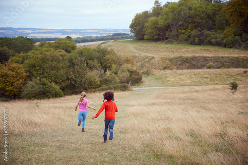 Rear View Of Group Of Children On Outdoor Activity Camping Trip Running Down Hill