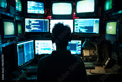 Rear View of Hacker Working Late at Night in a Dark Room