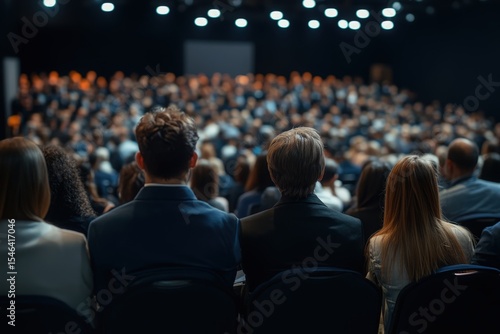 Rear view of large group of people attending a press conference in convention center. Focus is on foreground