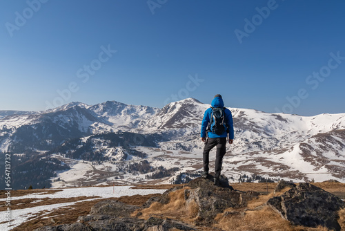 Rear view of man with backpack looking at snow capped mountain peak Zirbitzkogel and Kreiskogel in Seetal Alps, Styria (Steiermark), Austria, Europe. Hiking trail Central Alps in winter on sunny day