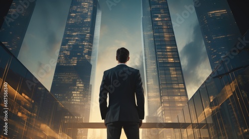 Rear view of successful businessman in suit standing in CEO office looking at big city view, thinking about future plans.