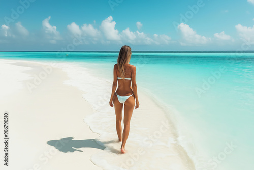 Rear view of woman in a bikini strolling along the sandy beach by the ocean.