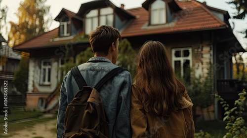 Rear view of young couple looking at their new house.