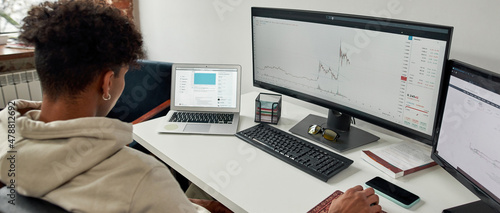Rear view of young male trader using laptop and pc, looking at computer screen to analyze statistics while sitting at home office desk