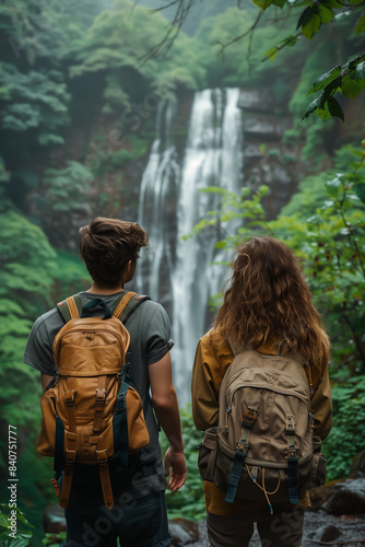 Rear view of young men and women carrying backpacks to waterfall tourism.