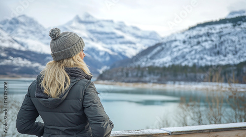 Rearview of the woman with blonde hair wearing a jacket and a winter cap, standing on the wooden deck near the lake, snowy mountains in the background, holiday or vacation, cold weather season tourism