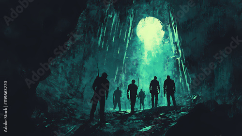 Rebellion under the shadows: defiant rebels plotting uprising in gritty underground lair with dramatic lighting. Moonspire. Illustration