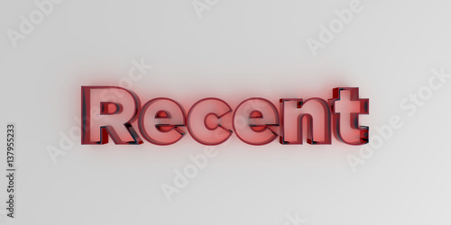Recent - Red glass text on white background - 3D rendered royalty free stock image.