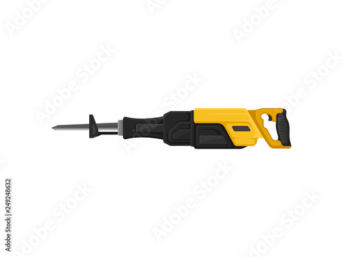 Reciprocating saw with steel toothed blade. Power tool for woodwork. Flat vector design