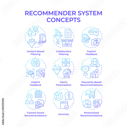 Recommender system blue gradient concept icons. Artificial intelligence, deep learning. Personalized content. Icon pack. Vector images. Round shape illustrations for article, blog post. Abstract idea