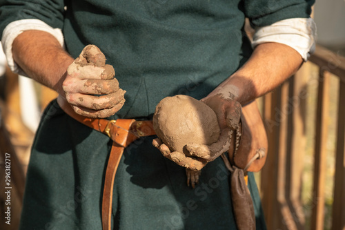 Reconstruction of an ancient craft. An artisan wrinkles clay to create pottery. Holds a lump of clay in his hand. Teaches pottery art. Shows how to sculpt. Dressed in an old outfit.