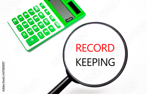 RECORD KEEPING text, inscription through a magnifying glass with a calculator. Record keeping word, concept.