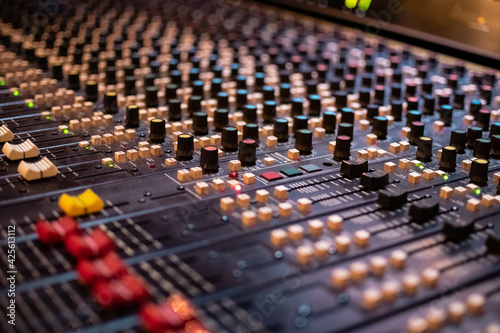 Recording with an audio mixing console turned on, using different faders, buttons and knobs