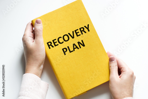 Recovery Plan word is written on a yellow notepad on the table, businessman's hands hold the notepad