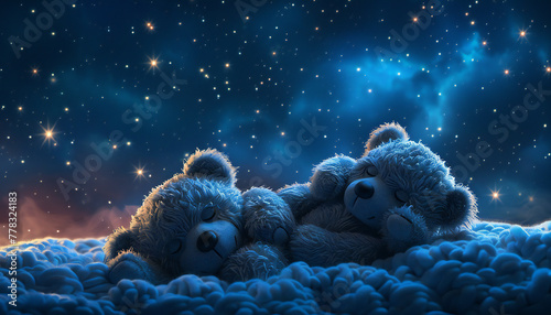 Recreation of two teddy bears hugging and sleeping peacefully in a magic blue night